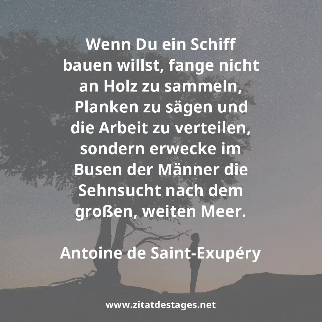 „wenn du ein schiff bauen willst, dann trommle nicht männer zusammen, um holz zu beschaffen, aufgaben zu vergeben und die arbeit einzuteilen, sondern lehre die männer die sehnsucht nach dem weiten, endlosen meer."... Sehnsucht, arbeit, motivation „ wenn du ein schiff bauen willst, dann trommle nicht männer zusammen um holz zu beschaffen, aufgaben zu vergeben und die arbeit einzuteilen, sondern lehre die männer die sehnsucht nach dem weiten, endlosen meer.. Wenn du ein schiff bauen willst, dann trommle.