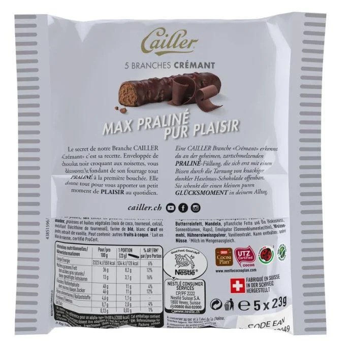 Cailler branche 115g is a swiss chocolate made by cailler of switzerland. The package contains five branches. Discover the cailler chocolate range and shop our collection of authentic swiss chocolate creations.. Praliné coated with milk chocolate (22%) and hazelnuts (5.6%) 115g